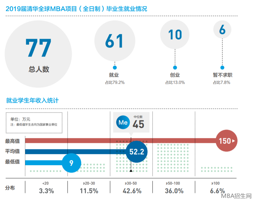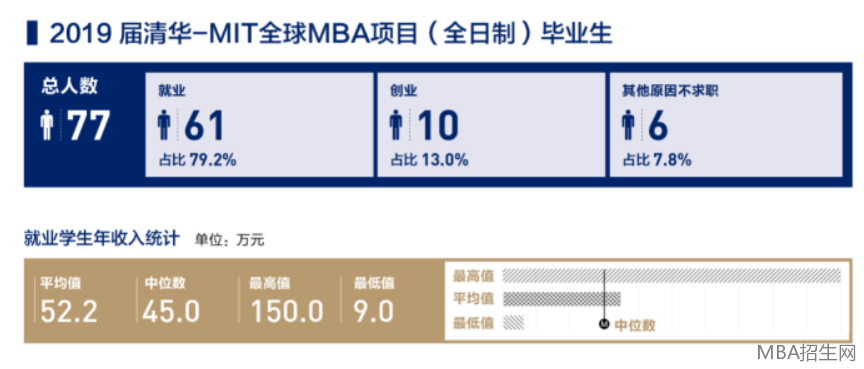 清華大學(xué)經(jīng)濟(jì)管理學(xué)院MBA2019年就業(yè)報(bào)告中,雖僅單獨(dú)列出了MIT項(xiàng)目的薪資信息,但也不難看出,MBA畢業(yè)生薪資水平較高,平均年薪為52.2萬元,高年薪高達(dá)150萬,年薪中位數(shù)為45萬元。