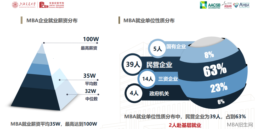 上海交通大學(xué)安泰經(jīng)管學(xué)院2020年就業(yè)報(bào)告中,畢業(yè)生就業(yè)領(lǐng)域以互聯(lián)網(wǎng)、高新科技和金融行業(yè)為主,MBA就業(yè)薪資平均35W,高達(dá)到100W。MBA就業(yè)單位性質(zhì)分布中,民營企業(yè)為39人,占到63%,2人赴基層就業(yè)。