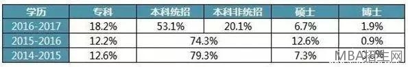 從學歷看,本科和碩士報考人數(shù)略有下降,專科和博士報考人數(shù)略有上升。雖然無學歷要求,但明顯的是學歷在不斷的走高。