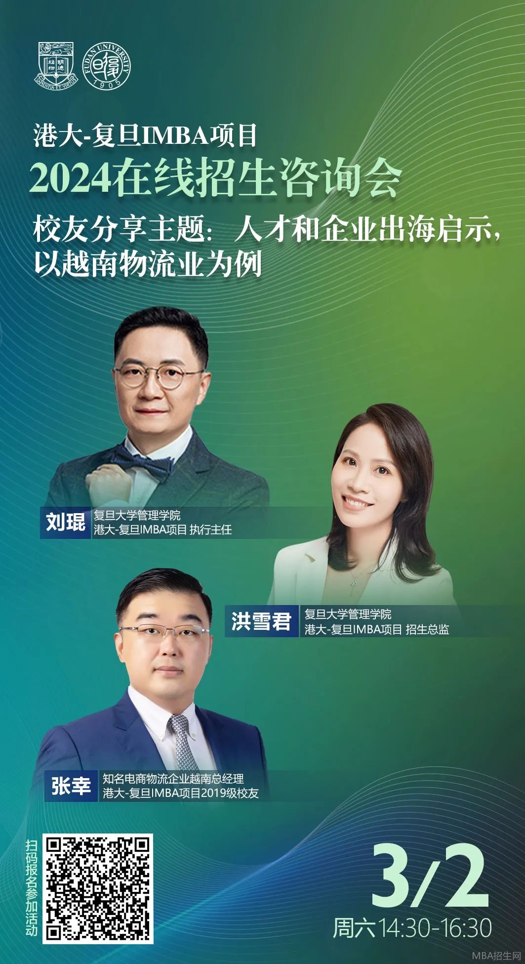 港大-復旦IMBA項目2024在線招生咨詢會時間:2023年3月2日(周六)14:30-16:30