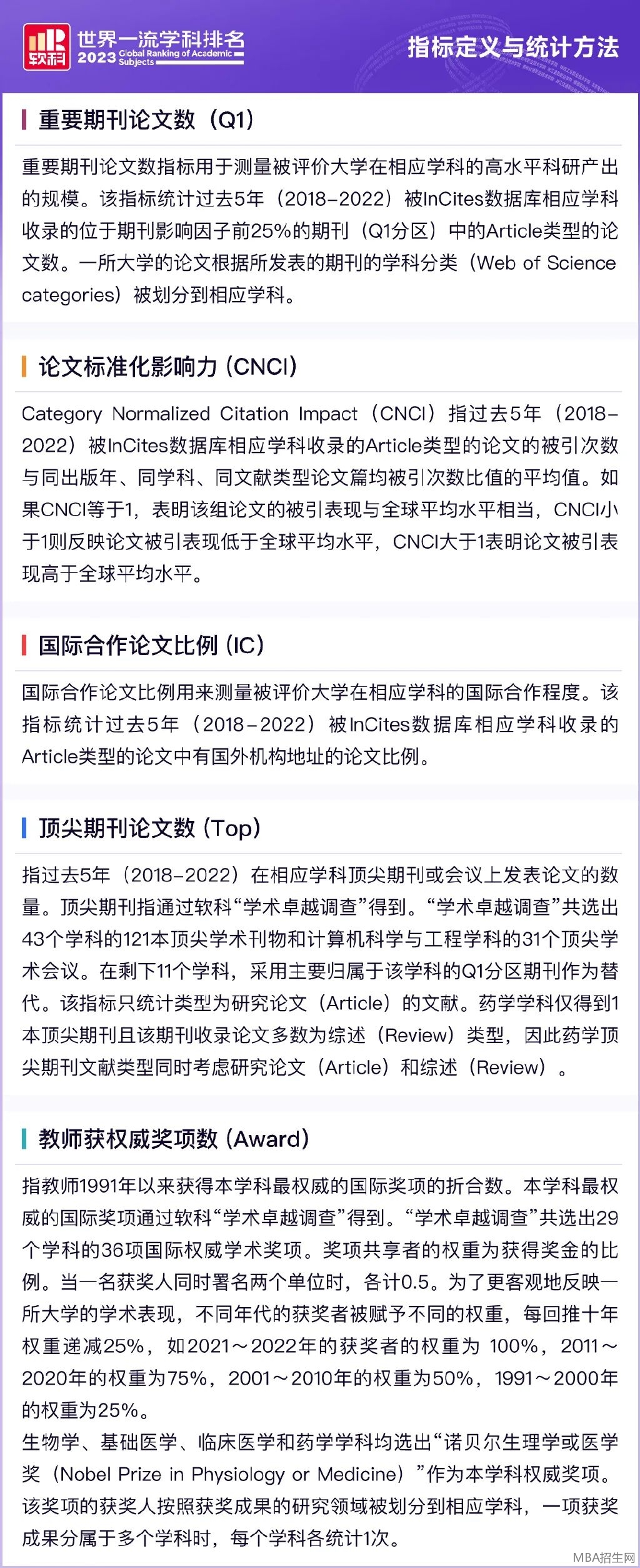 排名指標軟科《世界一流學科排名》使用一系列國際可比的客觀學術指標,按不同學科對世界各地高等教育機構進行衡量,具體指標包含: